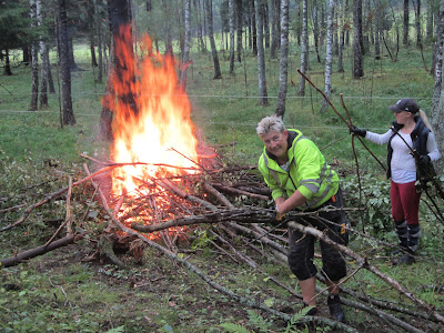 Jag har ju en liten pyroman-gen i mig så jag fortsatte att springa på eftermiddagen och röra runt i elden och slänga på en och annan pinne som jag hittade, ett tu tre vände vinden och jag fick en het svepning i fejset, samtidigt brände det till på några ställen då det landade små jäkla glödbitar på mig... mutter.