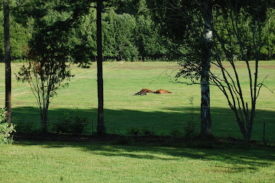 Lena, Sofie och jag har rensat och eldat upp sly och annat jox som låg på marken i den stora vinterhagen, vi släpade och drog ända tills vi var fullständigt dyngsura av svett, eller... säkert mest av regnet som började falla på oss.