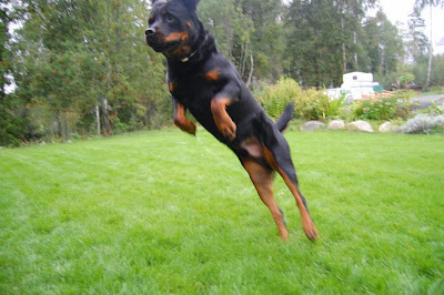 Då gick tankarna till vår Rottweiler Gazol som också blev sjövild när han var nybadad.