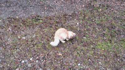Där fick han ligga på gatan på alla fyra och locka efter en helt ointresserad katt medans Rosé redan låg på förarsätet inne i bilen och mös...
