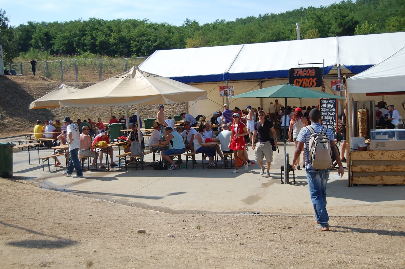 | och kön ringlar sig långt längre än blåa parasollet man set på tältet... |