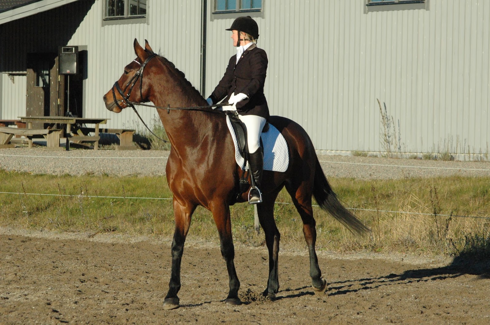 Väl där inne var han ju redan riktigt spänd, han gick snällt i solkatterna men kröp förbi domarbord och dressyrstaket, läktaren med folk gick bra men så sprätte han lite grus mot sargen, AS äckligt!
