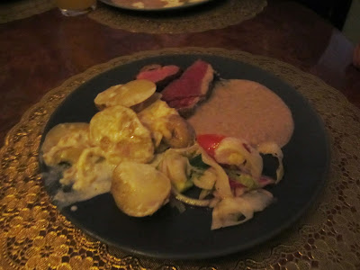 | Min tallrik (ja, jag hann ju slafsa i mig en del innan jag kom på att fota) Allt samma utom potatisen, jag fick broccoli och squachgratäng i stället. |